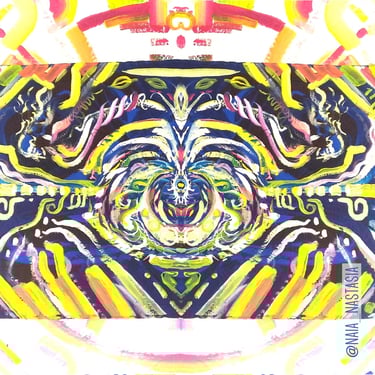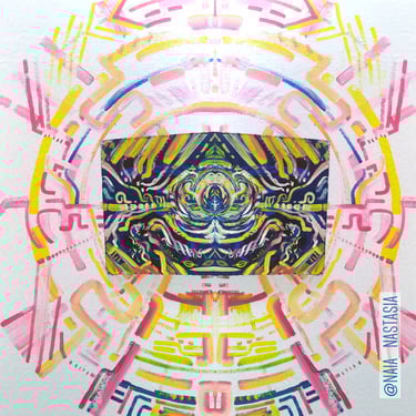 Je me suis égalment amusée à combiner ce tableau avec une peinture murale réalisée dans ma chambre, et remarquer à quel point elle combinait et se poursuivait, l'intégrant également avec la série Multiversos. J'ai aussi joué avec les effets miroir numériquement pour créer de nouvelles formes.