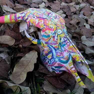L'approche du support de peinture original : un crâne de bœuf, était différente que pour d'autres œuvres. C'était avant tout les restes d'un animal. J'espère avoir honoré sa mémoire, et j'ai adoré peindre en volume. J'ai laissé l'intuition me guider quant à la répartition des couleurs, et la symbolique que j'ai pu suggérer.