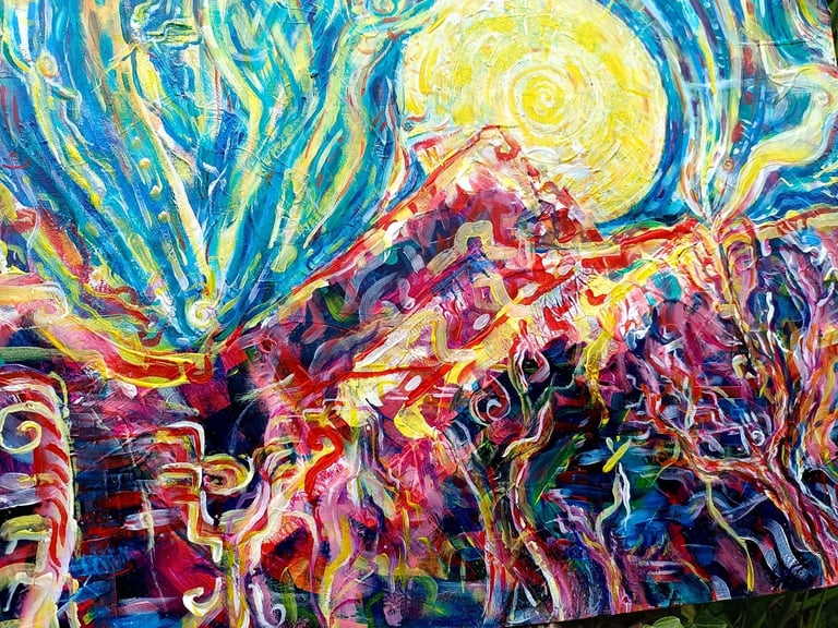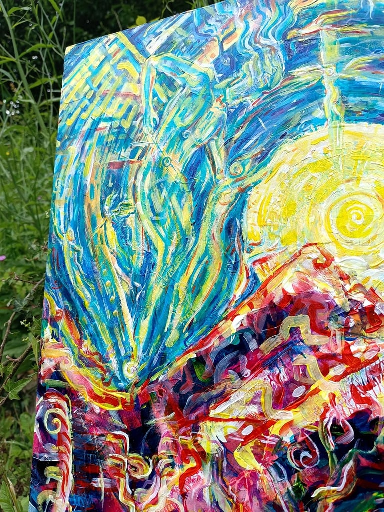 Le long de la création de ce tableau, j'ai demandé sur les réseaux sociaux votre avis, ce que vous y voyiez, et j'ai adoré vos interprétations. Certain.es y ont vu un parallèle entre les enfers, sur terre, et des êtres angéliques au paradis, au ciel. De mon côté, j'y vois le souffle de Gaïa, la montagne qui se réveille, ses habitants la célébrant et en effet, aussi, des êtres immatériels et angéliques dans le ciel, sous le regard bienveillant de la terre.